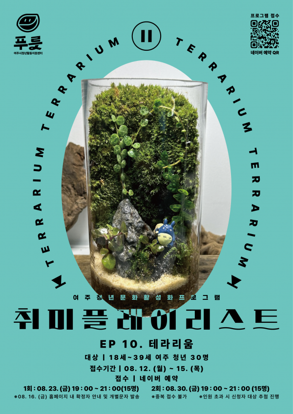 여주시 청년활동지원센터 관계자는 “매번 뜨거운 관심을 받는 취플리 프로그램이 벌써 열 번 째 에피소드로 청년들과 만나게 됐다며 무더운 여름을 마무리 하는 8월을 맞아 테라리움이라는 컨텐츠를 기획한 만큼 청년들이 자신만의 작은 숲을 만들어 나가며 지친 몸과 마음을 치유하는 시간이 되길 바란다”고 말했다.