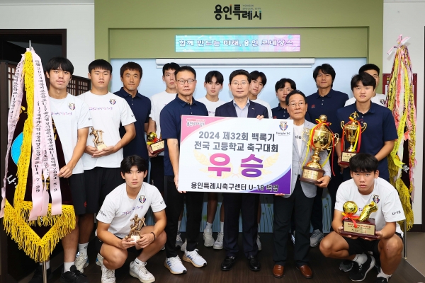 이 시장은 이날 용인시축구센터U18덕영 선수들이 참가한 ‘제32회 백록기 전국고교축구대회’ 우승컵과 우승깃발 봉납식에서 선수들에게 축하를 건넸다.