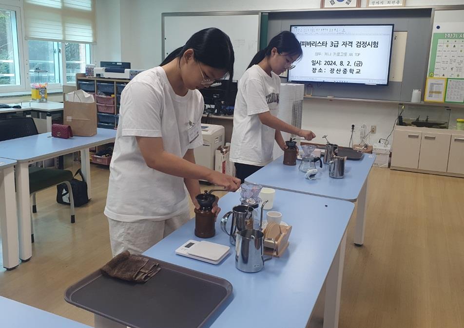 장산중학교는 방학 기간 7월 22일부터 8월 2일까지 매일 2시간씩 홈바리스타 자격증 과정을 운영했다.