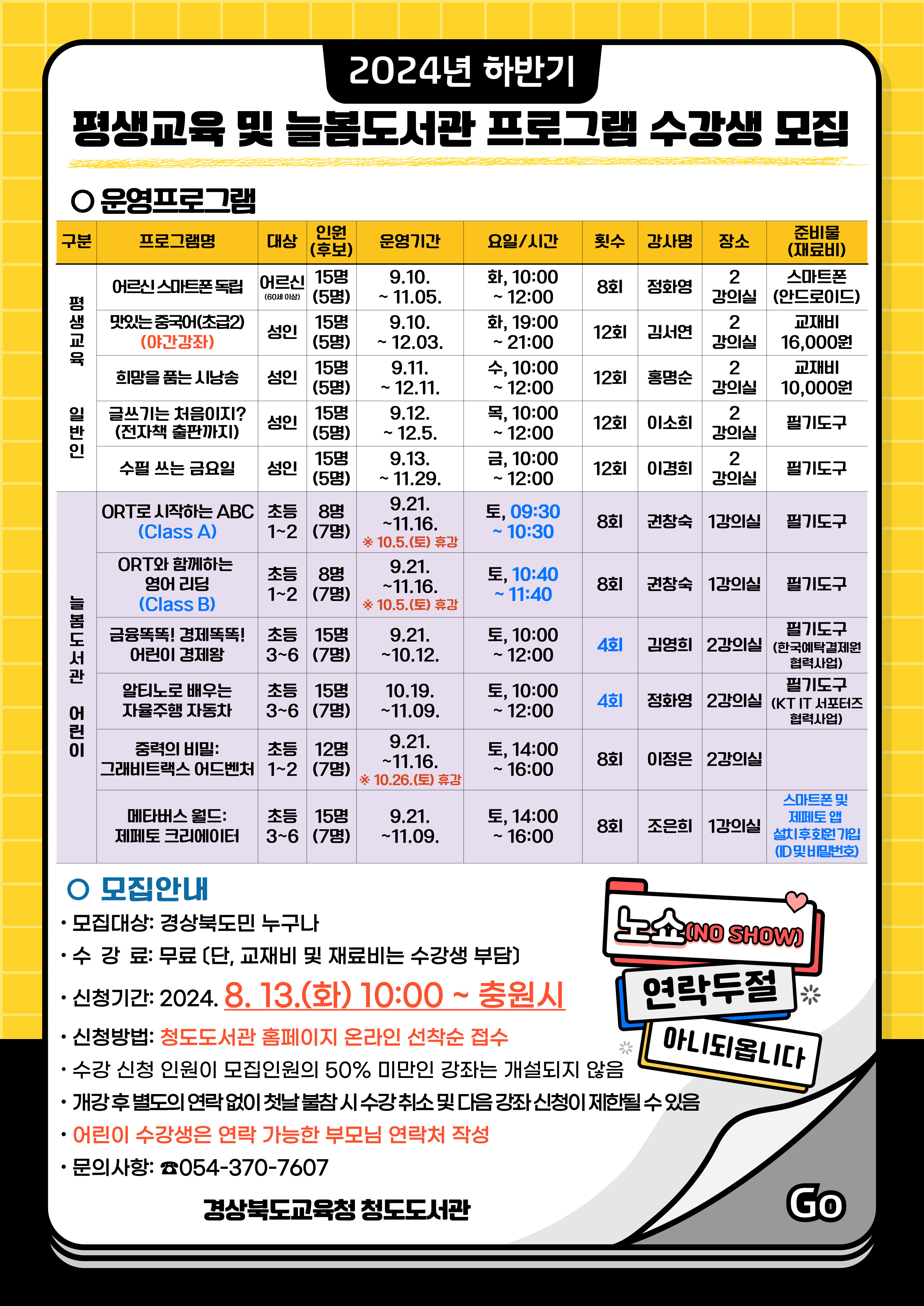 경상북도교육청 청도도서관(관장 서경희)은 8월 13일(화)부터 지역주민과 학생을 대상으로 2024년 하반기 평생교육 및 늘봄도서관 프로그램 수강생을 모집한다.