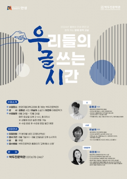 [금요저널] 안성시 박두진문학관은 8월 7일부터 8월 23일까지 ‘2024 ‘올해의 안성 문인’과 함께 하는 문예 창작 교실 : 우리들의 글 쓰는 시간’ 수강생 모집을 진행한다고 밝혔다.