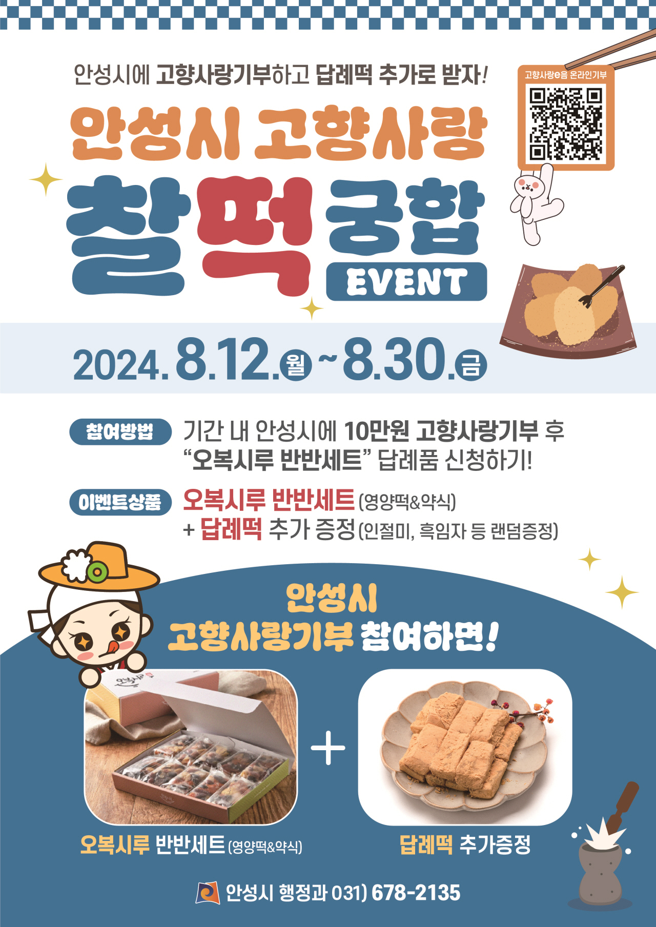 시는 이벤트 기간 동안 안성시에 전액 세액공제가 되는 10만원을 고향사랑기부하는 경우, 당초 3만원에 영양떡과 약식 20개로 제공되던 ‘오복시루 반반세트’에 인절미 등 답례떡을 추가로 증정한다.