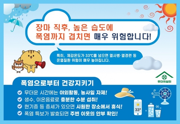 [금요저널] 이천시는 장마 이후 높은 습도와 폭염이 지속됨에 따라 이달 15일까지 폭염 집중대응기간으로 정하고 열사병, 열탈진 등 온열질환에 대한 주의를 당부했다.