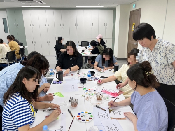 1차시는 감성태교 멋글씨로 붓으로 이야기를 나누며 지역사회에서 공방을 운영하는 강사 2명이 진행했다.