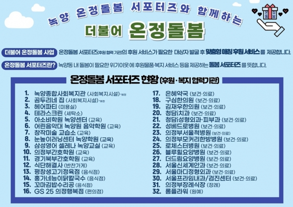 더불어 온정돌봄 사업의 후원 및 복지 서비스 협력기관은 △헤어파티 △테라스크린 △식단해결사 △평창생고기정육점 △홍가네능이닭칼국수 △꼬마김밥수리공 △GS25 의정행복점 △아소비학원 녹양센터 △어린음악대 녹양원 음악학원 △창작미술교습소 △눈높이러닝센터 녹양학원 △삼성영어 셀레나 녹양교실 △의정부간호학원 △경기북부간호학원 △은혜약국 △구심한의원 △김재우한의원 △청담i치과 △청담i성형외과·피부과 △성베드로병원 △의정부서울척병원 △의정부모커리한방병원 △로체스터병원 △블루힐요양병원 △더드림요양병원 △서울신세계안과 △서울마디정형외과 △서울프라임내과/검진센터 △의정부장례식장 △롬플라워 △녹양종합사회복지관 △곰두리네 집이다.