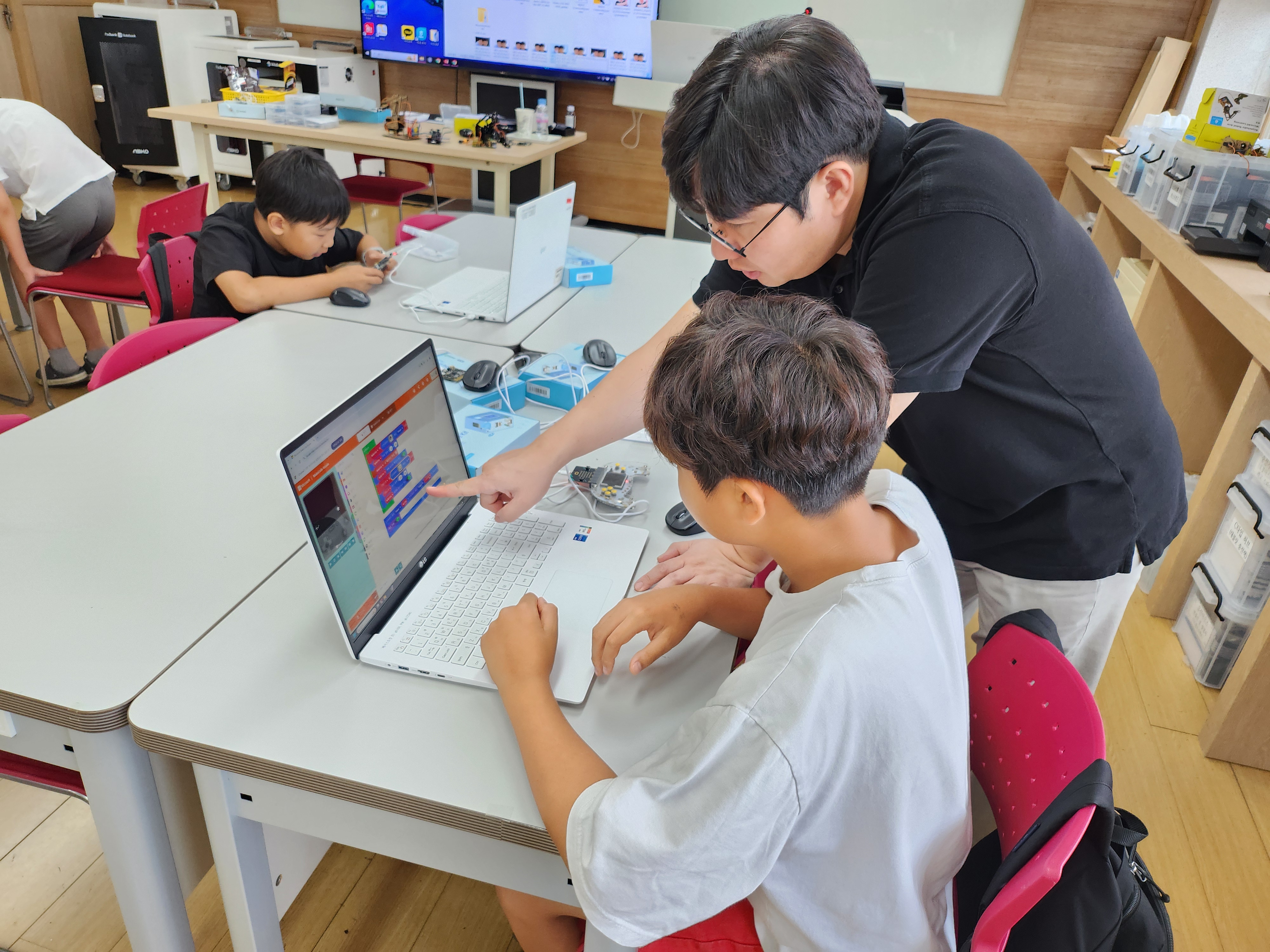□ 발명기초반에 참여한 학생들은 프로그래밍 기초 교육을 시작으로 마이크로비트 코딩을 통한 관절 로봇 팔을 제어, 레트로 아케이드 게임 제작, AI 카메라(허스키렌즈) 발명품 제작 등의 다양한 미니 프로젝트를 완성하였다. 로봇 메이킹 과정에서 학생들은 문제 해결 능력을 키우고, 코드의 실시간 반응을 직접 체험하였다.