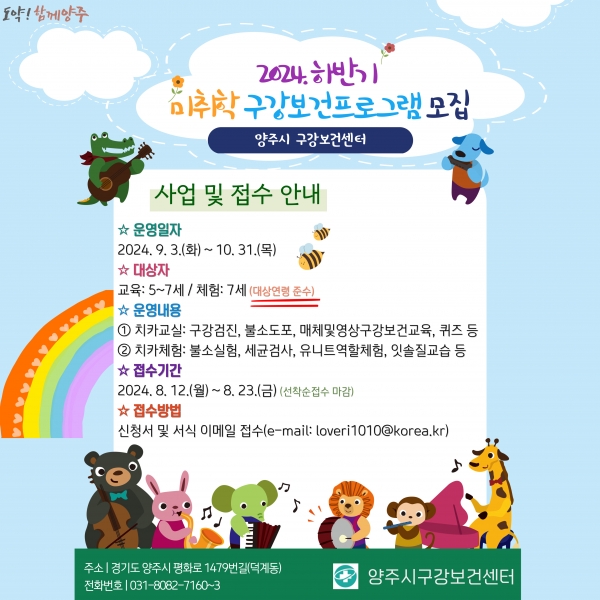 [금요저널] 양주시가 오는 12일부터 23일까지 관내 구강보건센터에서 ‘하반기 똑똑이 치카 교실 및 재미있는 치카 체험’ 프로그램 참여자를 모집한다고 밝혔다.