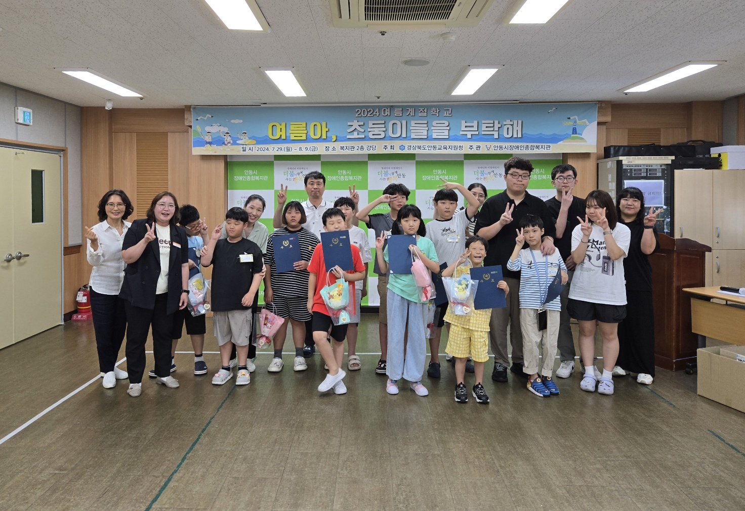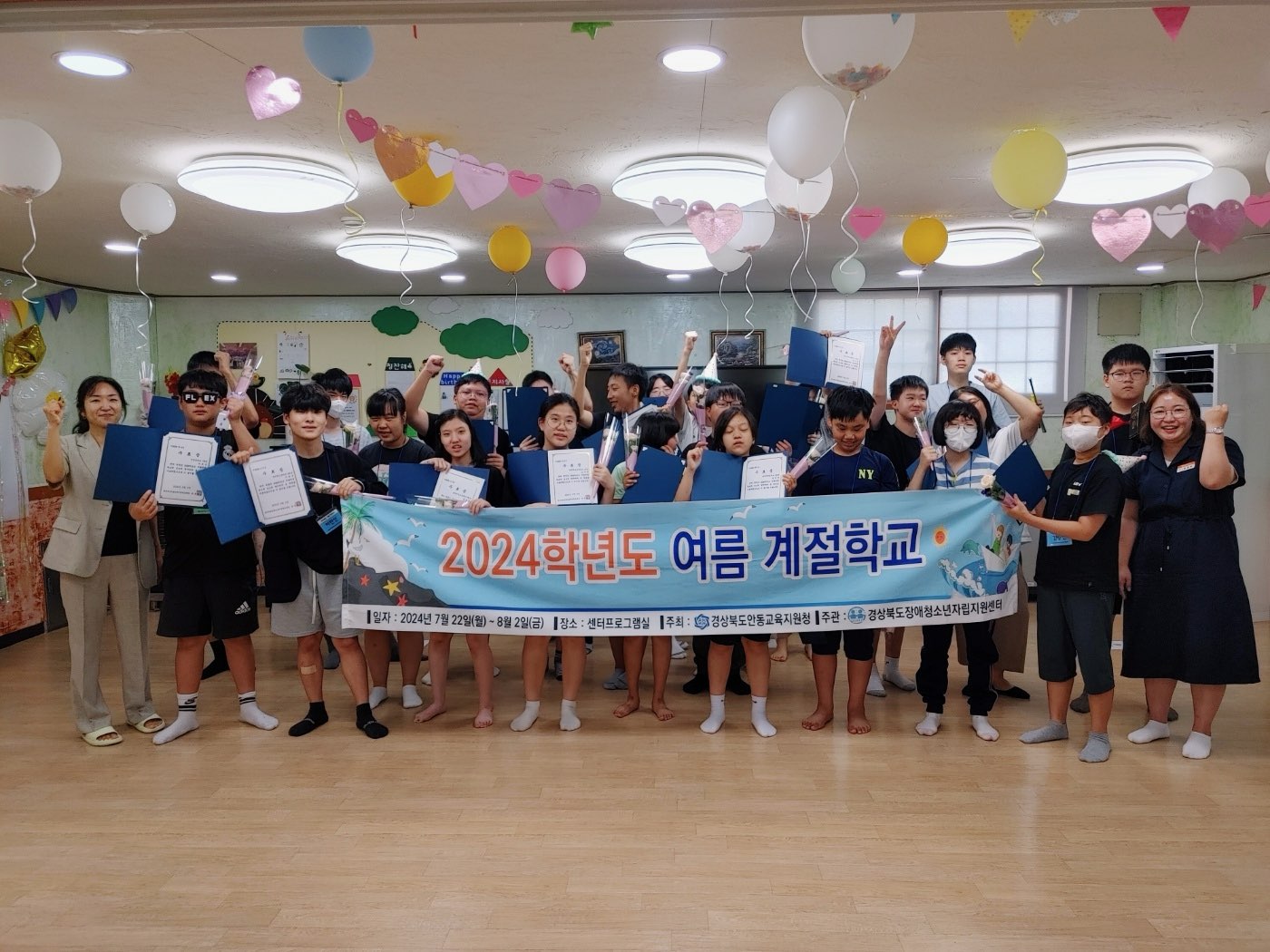 □ 경상북도안동교육지원청(교육장 안중환)은 8월 9일(금)부로 안동 관내 초·중·고등학교 특수학급 학생(초등 12명, 중·고등 30명)을 대상으로 운영한 「2024학년도 특수교육대상학생 여름 계절학교」를 성황리에 마치고 특수교육대상학생과 학부모, 안동교육지원청 특수교육 담당 장학사, 안동특수교육지원센터 교사 등이 참석한 가운데 수료식을 진행했다.