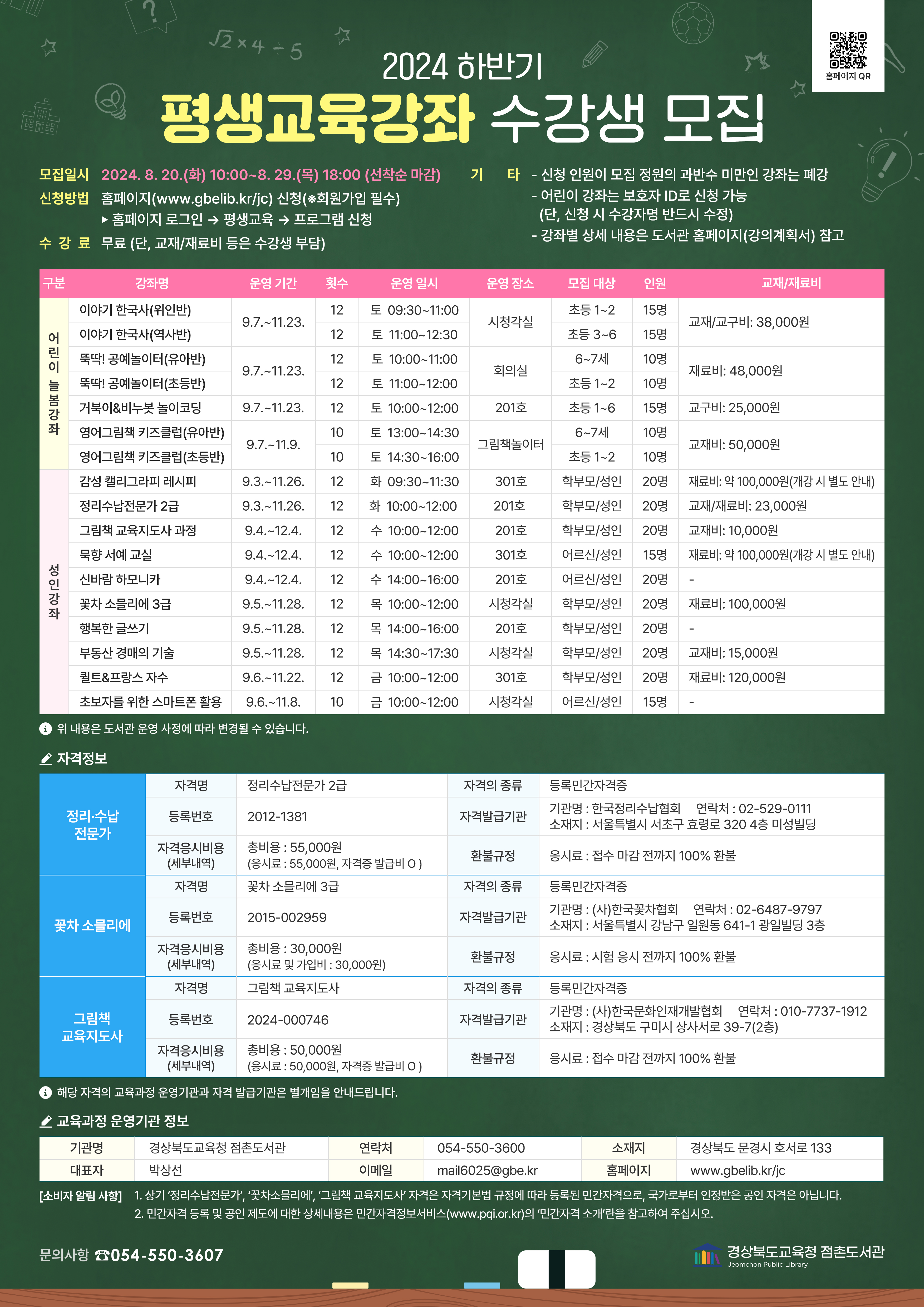 □ 경상북도교육청 점촌도서관(관장 박상선)은 지역주민들의 평생 배움을 통한 자기 계발과 여가선용 기회를 제공하고자 ‘2024년 하반기 평생교육강좌’를 개설해 수강생을 모집한다.