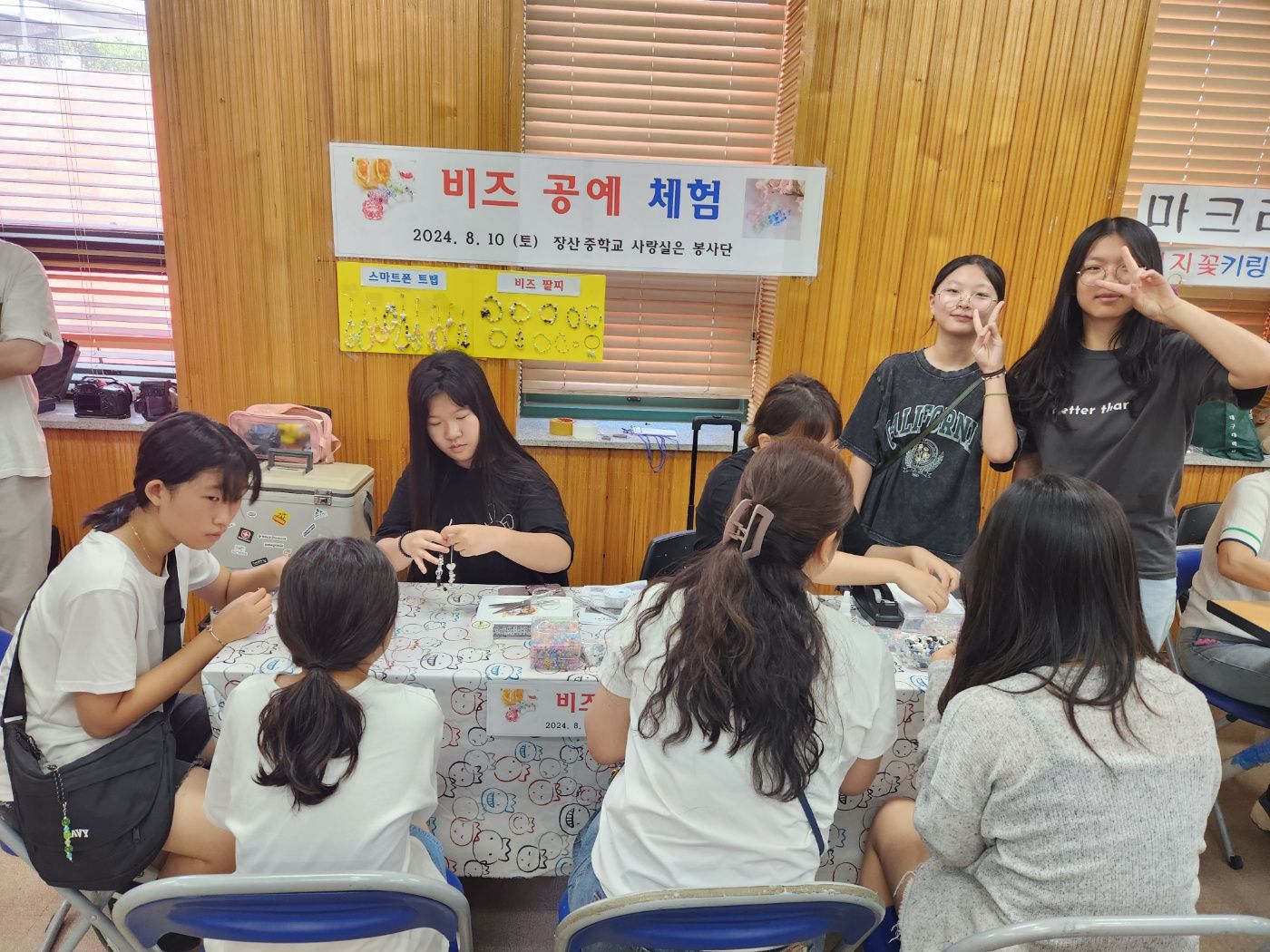 장산중학교(교장 조보옥) 사랑실은봉사단은 8월 10일 농업인 회관에서 열린 청소년의 날 축제에 참여하여 비즈 공예 체험 부스를 운영 했다.