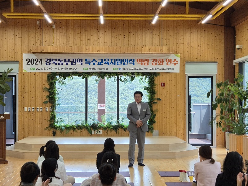포항교육지원청(교육장 천 종 복)은 2024년 8월 7일(수)부터 9일(금)까지 3일간, 내연산 치유의 숲에서 2024학년도 경북동부권역(포항, 영덕, 울진, 청송, 울릉, 명도학교) 유·초·중·고등학교, 특수학교에 소속된 특수교육지원인력(사회복무요원 및 특수교육실무사) 약 90명을 대상으로 ‘경북동부권역 특수교육지원인력 역량 강화 연수’를 실시하였다.