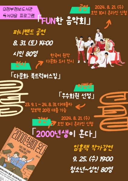 공연은 8월 31일 오후 2시 정보도서관 시네마천국에서 운영하며 퍼니밴드의 흥겨운 연주로 도서관을 가득 채울 예정이다.