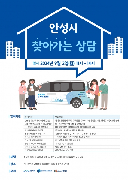 [금요저널] 안성시는 오는 9월 2일 11시부터 오후 2시까지 하나로마트 안성농협 본점 앞에서 안성시민을 대상으로 ‘2024년 하반기 찾아가는 주거복지 이동상담’을 운영한다고 밝혔다.