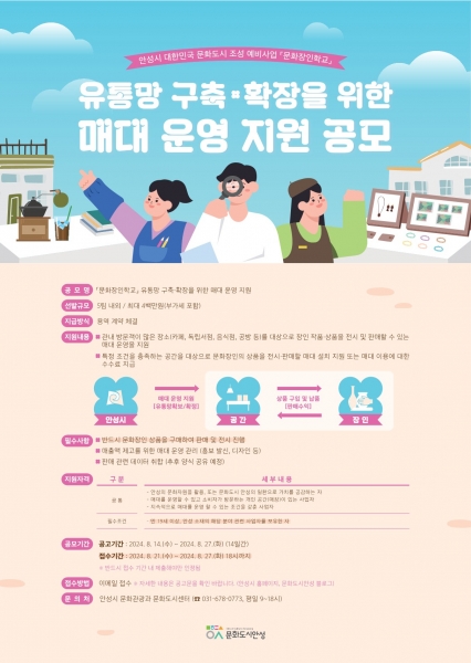 [금요저널] 안성시가 대한민국 문화도시 조성 예비사업의 일환으로 진행되었던 ‘문화장인학교’를 통해 도출된 문화장인들의 개별 프로젝트 결과물을 판매·전시하기 위한 매대 운영 지원 사업의 참여자를 오는 8월 27일까지 모집한다.