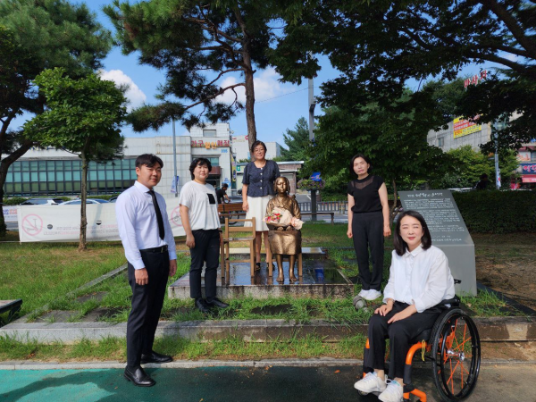 더불어민주당 황세주, 최승혁, 이관실, 황윤희 의원은 이날, 무더운 날씨에도 불구하고 먼지로 뒤덮인 평화의소녀상 주변을 닦고 훔치며 광복절의 정신을 되새겼다.