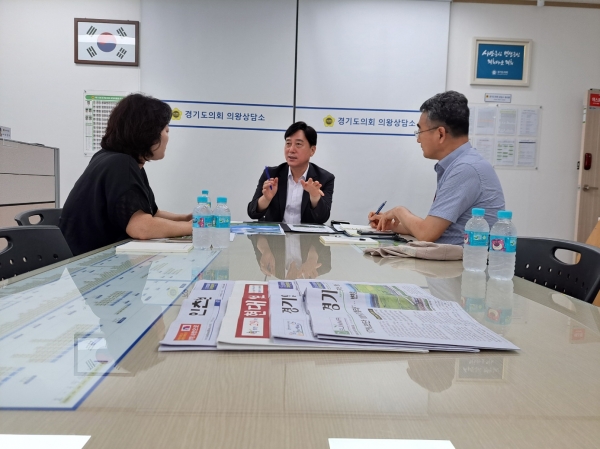[금요저널] 경기도의회 김영기 의원은 20일 도의회 의왕상담소에서 의왕시청 공원녹지과 관계자들을 만나 의왕시 공원 내 기후 위기 대응 및 폭염 대책과 관련한 계획인 냉각 포그 조성 지원사업을 논의하는 시간을 가졌다.