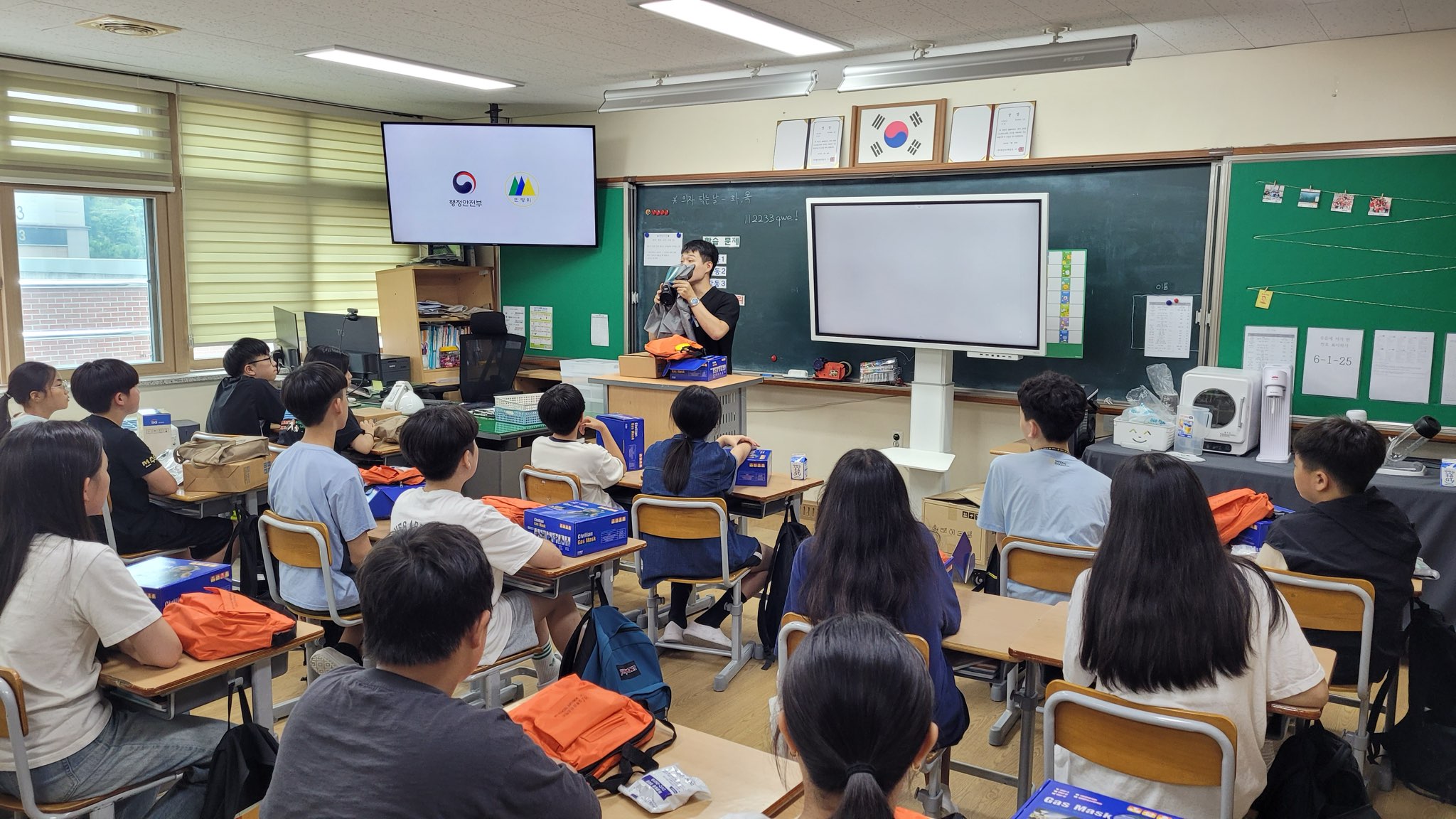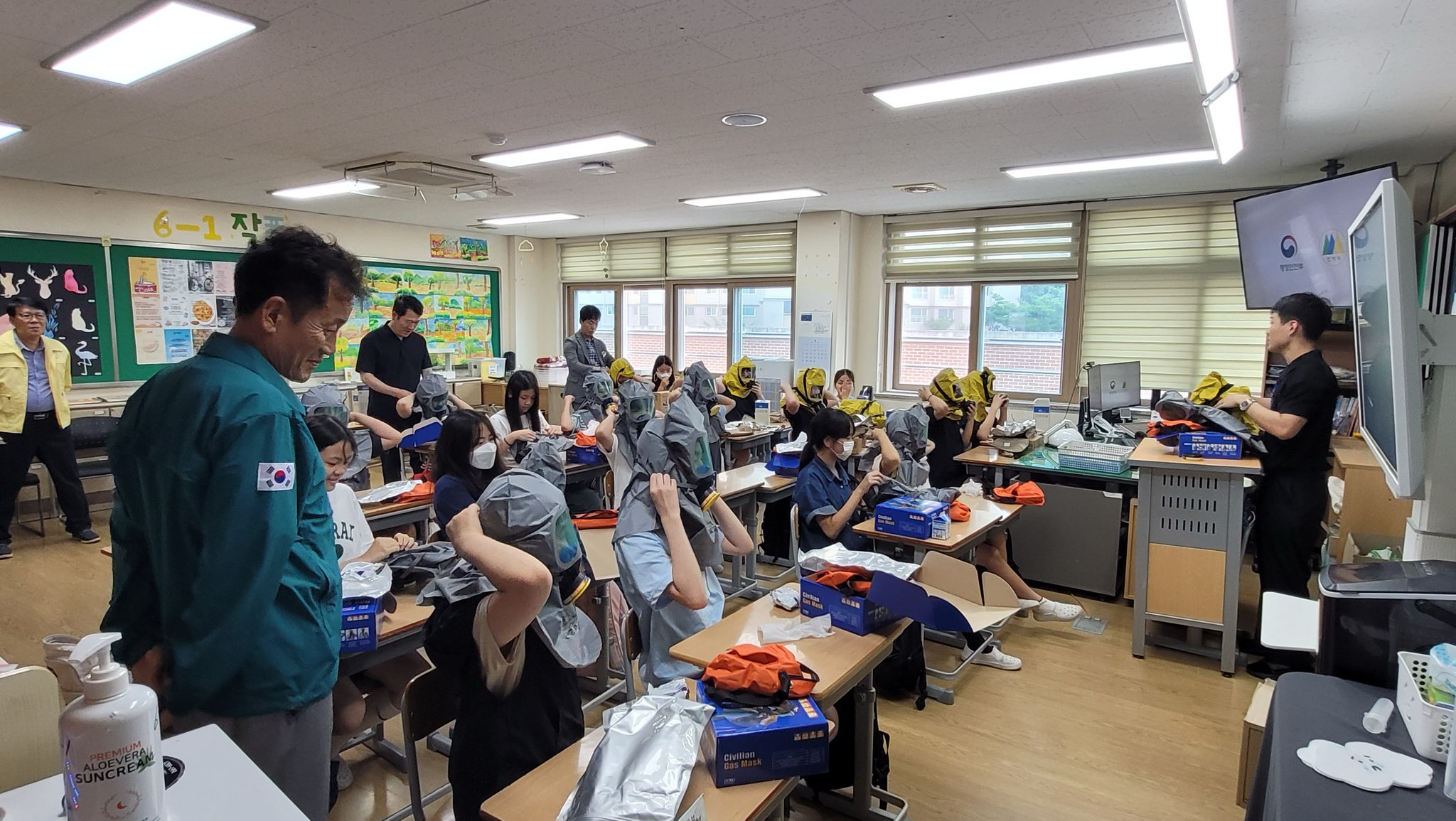 20일(화) 훈련에 참여한 구미왕산초등학교 학생 및 교직원 등은 각 교실에서 방독면 착용 동영상을 시청하고 담임교사의 방독면 착용 시연 후 학생 전원이 방독면을 직접 착용해보는 훈련을 수행하였다.