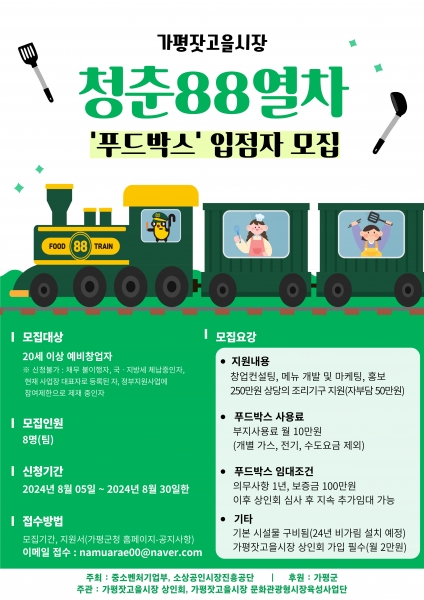 [금요저널] 가평군은 가평잣고을시장에서 지역경제 활성화를 위해 함께할 ‘청춘88열차 푸드박스’ 입점 희망자를 모집하고 있다고 밝혔다.