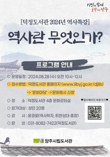 [금요저널] 양주시가 오는 28일 관내 덕정도서관에서 일일 강사로 윤경로 역사학자를 초청해 역사 주제 특강 ‘역사란 무엇인가?’를 개최한다고 밝혔다.