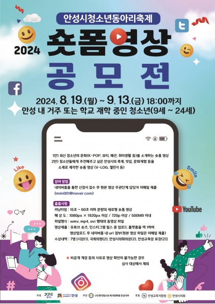 그 외 숏폼 영상 공모전 관련 자세한 내용은 한국청소년복지문화원 안성지부 홈페이지공지사항에서 확인 가능하다.