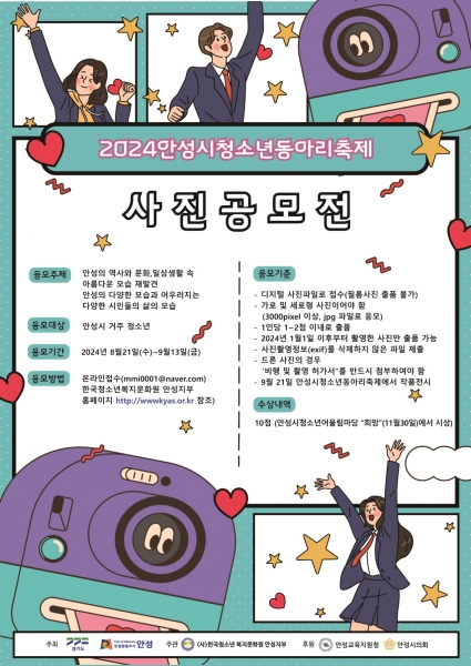 특히 공모사진 중 예비 선정된 사진과 수상사진은 9월 21일 개최되는 ‘2024 안성시청소년동아리축제’ 당일 전시하며 시상은 최종 심사를 통해 총 10점의 작품을 선정해 안성시 청소년어울림마당 ‘희망’ 개회일인 11월 30일 표창한다.