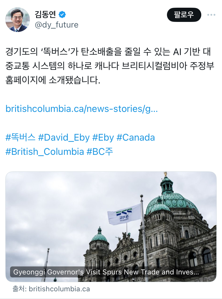 김동연 경기도지사는 22일 자신의 누리소통망(SNS)에 “경기도의 ‘똑버스’가 탄소배출을 줄일 수 있는 AI기반 대중교통 시스템의 하나로 캐나다 브리티시컬럼비아 주정부 홈페이지에 소개됐다”며 링크를 공유했다.