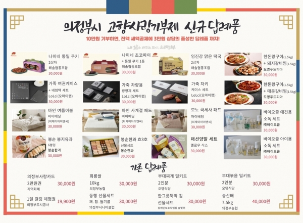 [금요저널] 의정부시는 고향사랑기부제 참여 유도를 위한 답례품 16종을 추가 선정했다고 23일 밝혔다.