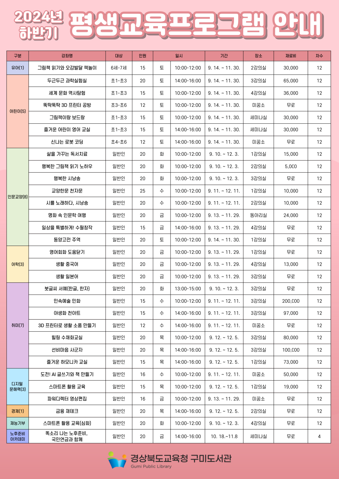 □ 경상북도교육청 구미도서관(관장 박귀훈)은 8월 23일(금)부터 9월 6일(금)까지 도서관 홈페이지를 통해 2024년 하반기 평생교육프로그램 수강생을 모집한다고 밝혔다.