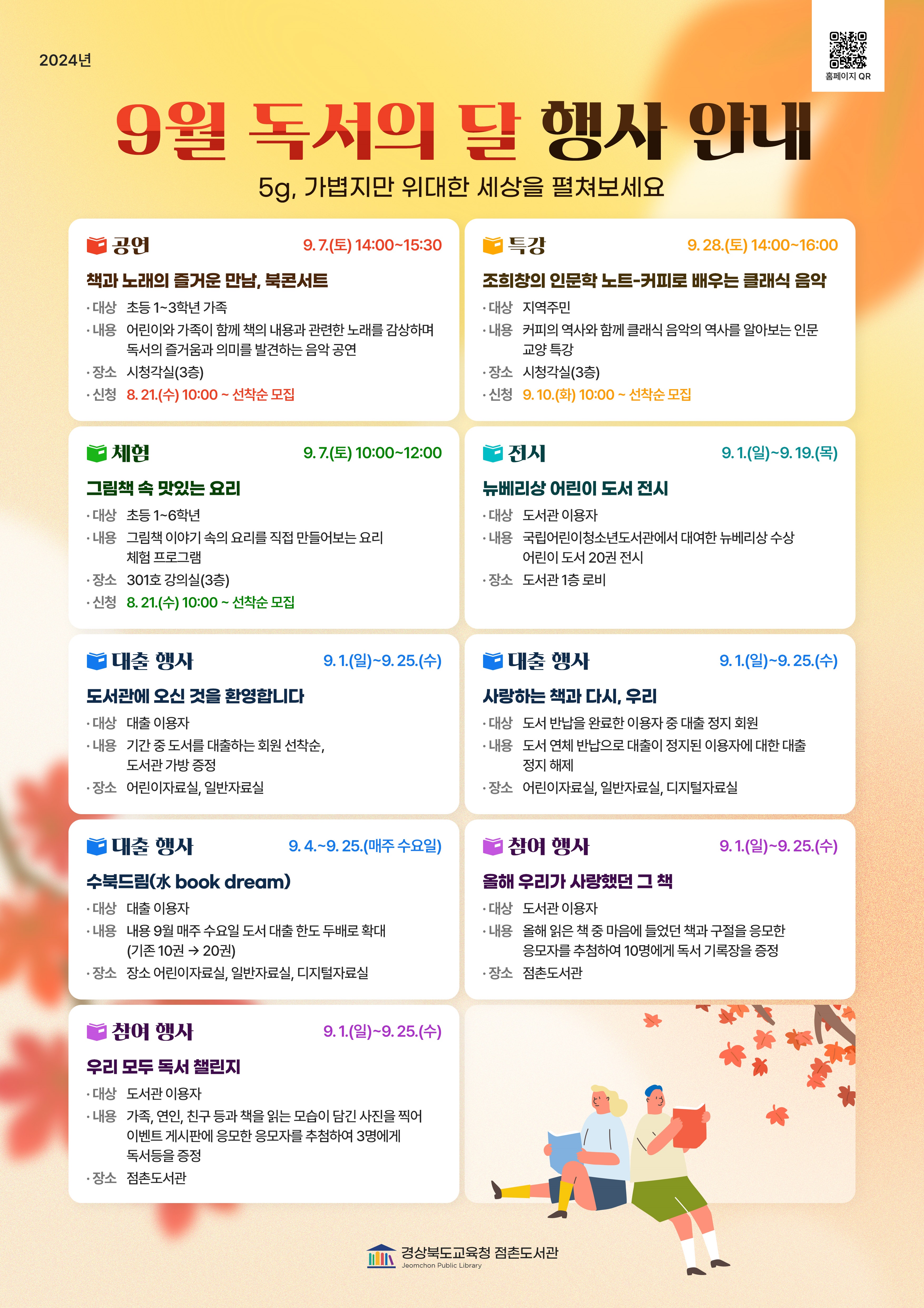 □ 경상북도교육청 점촌도서관(관장 박상선)은 9월 독서의 달을 맞아 지역 주민들의 독서 생활을 활성화하기 위해 ‘5g, 가볍지만 위대한 세상을 펼쳐보세요’를 주제로 다양한 독서문화 행사를 운영한다고 밝혔다.
