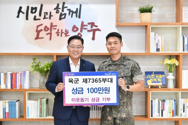 강수현 양주시장은 “작년에 이어 올해에도 소중한 성금을 기부해 주셔서 감사하며 제7365부대의 따뜻한 온정을 어려운 이웃에게 잘 전달하겠다”고 말했다.
