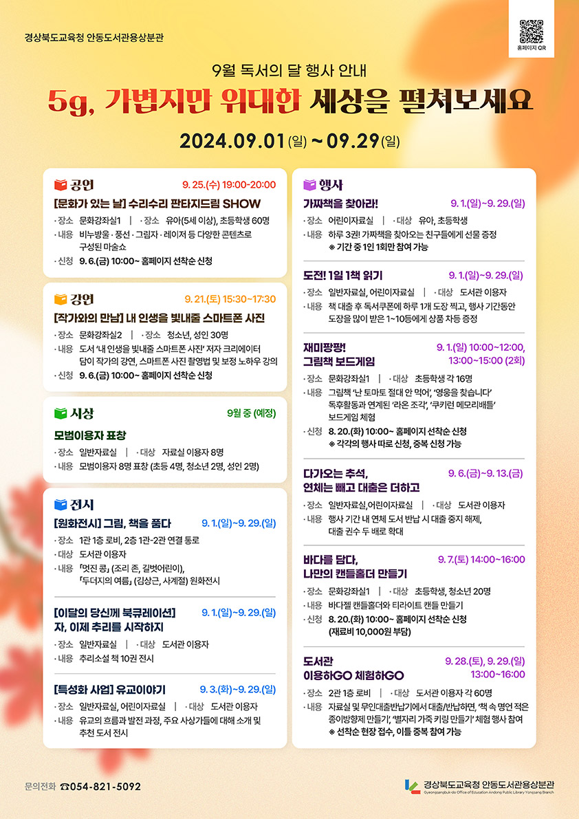 □ 행사와 관련한 자세한 사항은 홈페이지(www.gbelib.kr/adys)를 참고하거나, 안동도서관용상분관(☎054-821-5092)으로 문의하면 된다.