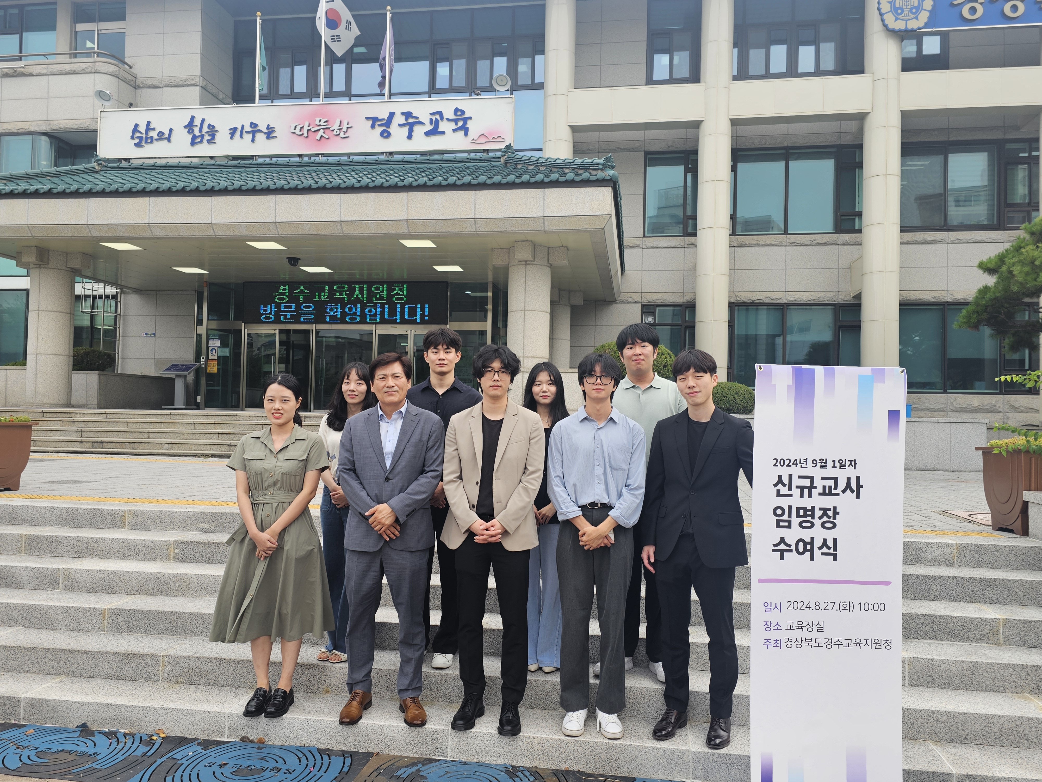 경상북도경주교육지원청(교육장 권대훈)은 8월 27일(화) 오전 10시에 경주교육지원청 교육장실에서 2024년 9월 1일자 임용 초등 신규교사 8명이 참석한 가운데 ‘신규 교사 임명장 수여식’을 개최하였다.