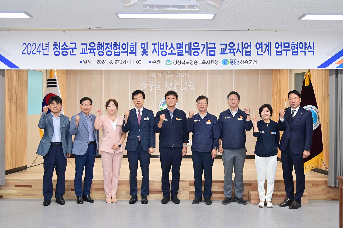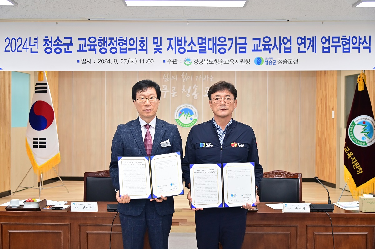 경상북도청송교육지원청(교육장 신덕섭)은 8월 27일(화) 청송교육지원청 대회의실에서 「2024년 청송군 교육행정협의회」개최 및 「지방소멸대응기금 교육사업 연계 업무협약」을 체결하였다.