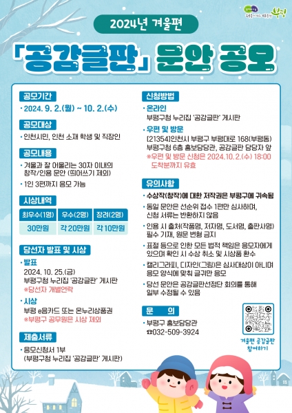 [금요저널] 부평구가 오는 2일부터 다음 달 2일까지 한 달간 ‘2024년 겨울편 공감글판’ 문안을 공모한다.