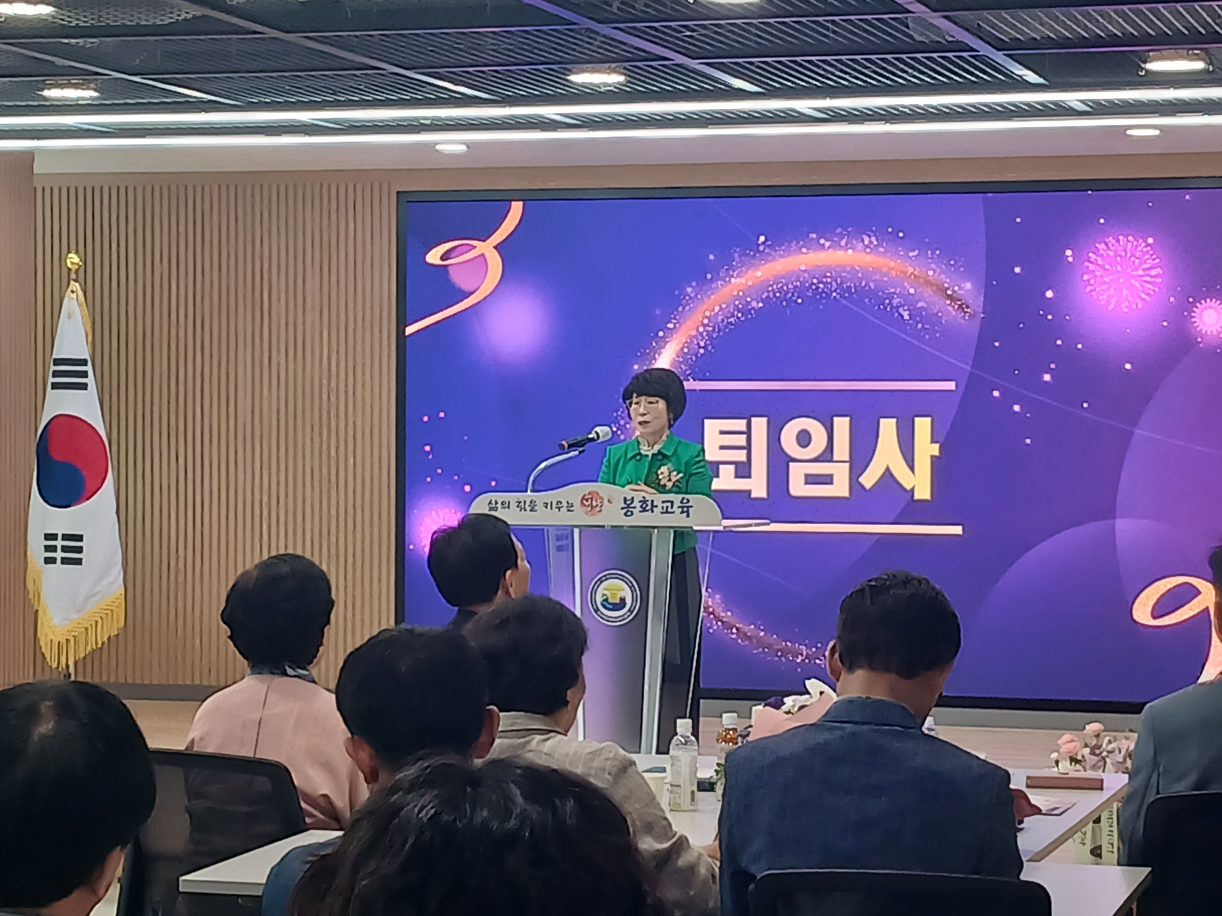 권혜자 봉화교육장은 “그 동안 여러 교직원들과 선후배님들의 도움으로 무사히 정년퇴직을 하게 되어 감사하고 감회가 새롭다”며, 퇴직 후 가보지 않은 새로운 길을 들어서는 설레임이 있으며 퇴직 후에도 지역사회에서 작은 교육 봉사자로서 삶을 살고 싶다고 소회를 밝혔다.