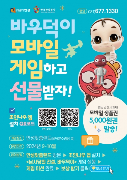 바우덕이 모바일 게임은 안성맞춤랜드에 방문해 ‘조인나우’앱을 설치 후 참여가 가능하며 아홉 개의 미션 완료 후 간단한 설문조사까지 완료하면, 모바일 상품권을 제공하는 선착순 이벤트도 같이 실시한다.