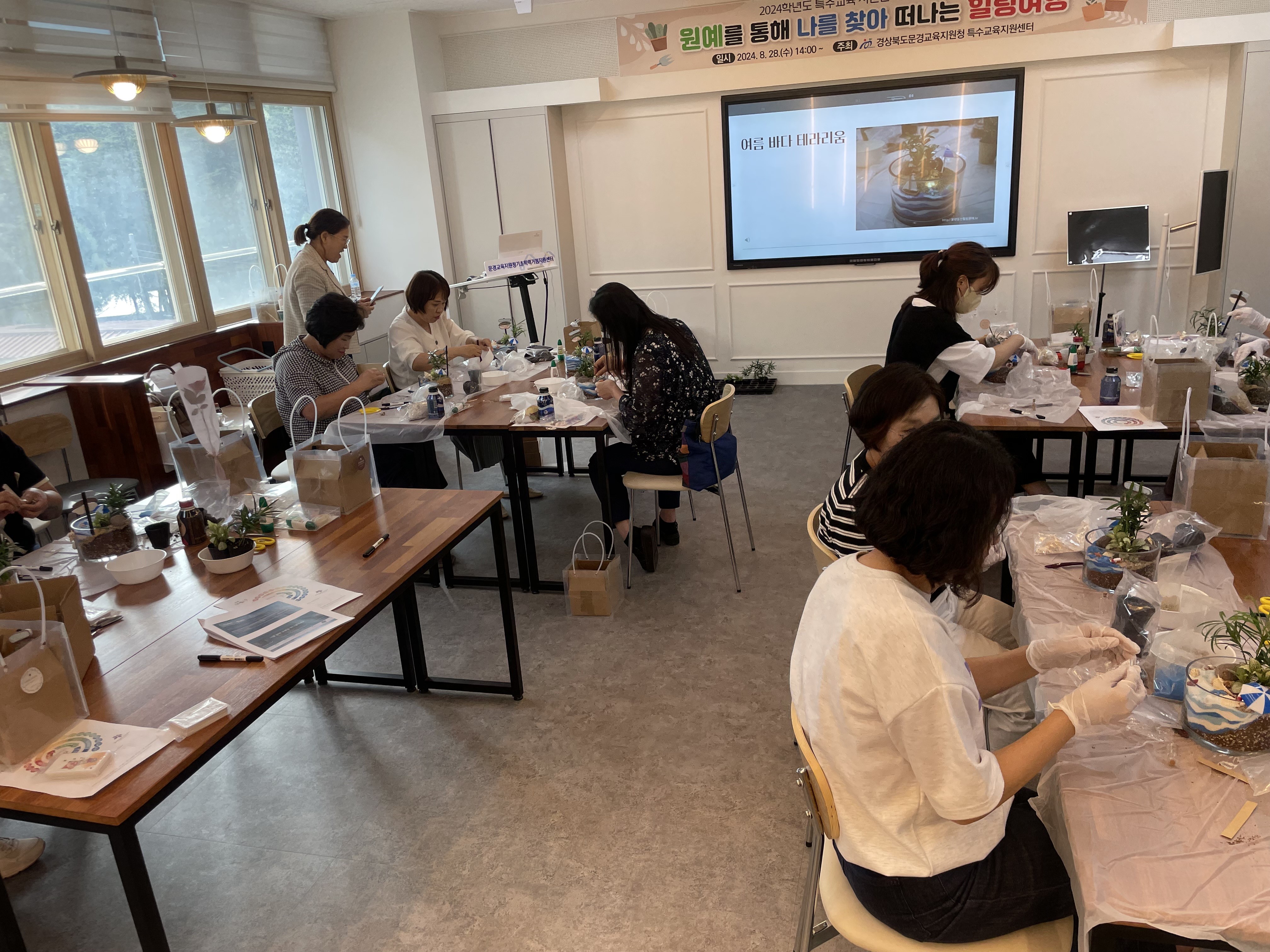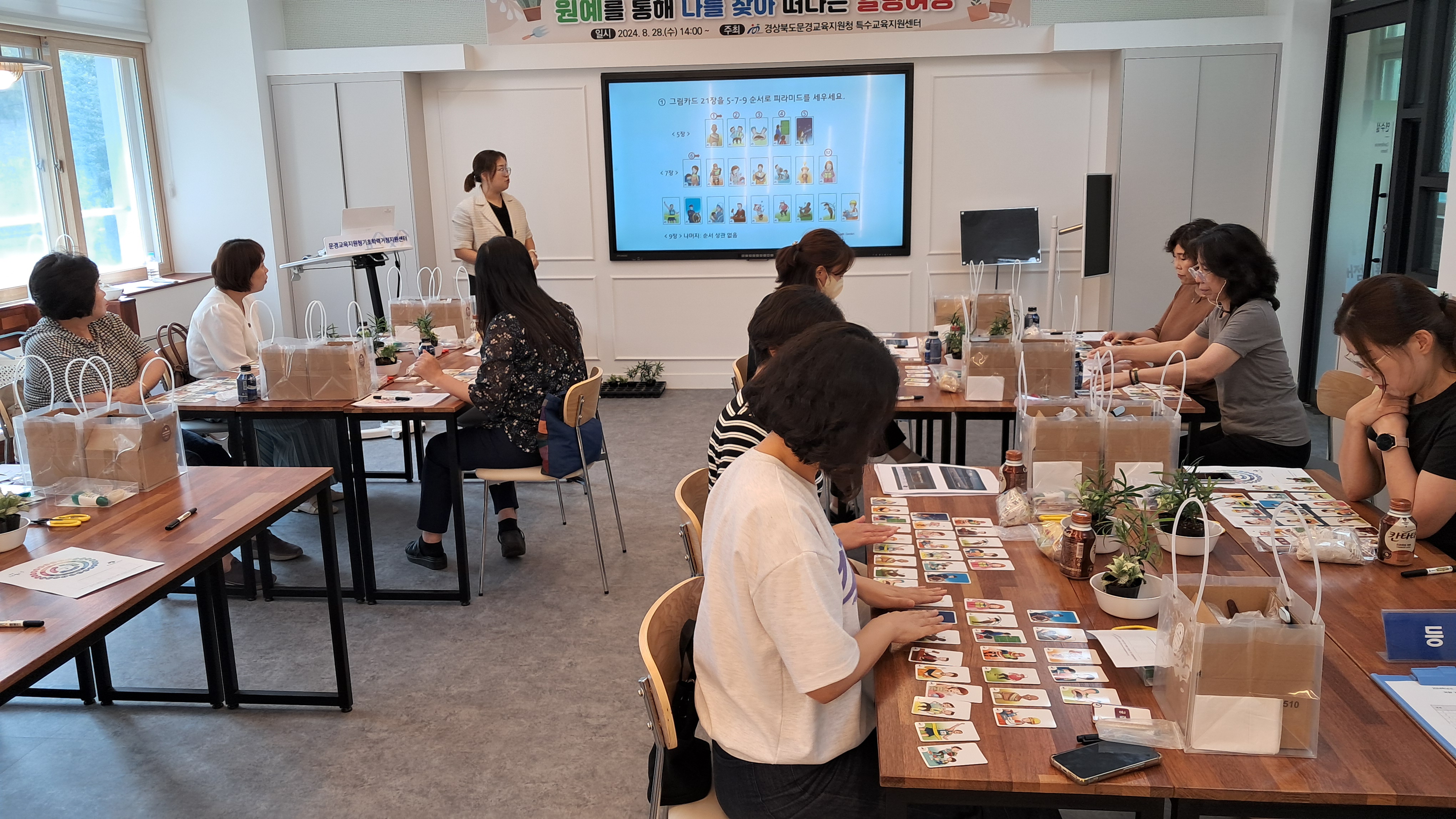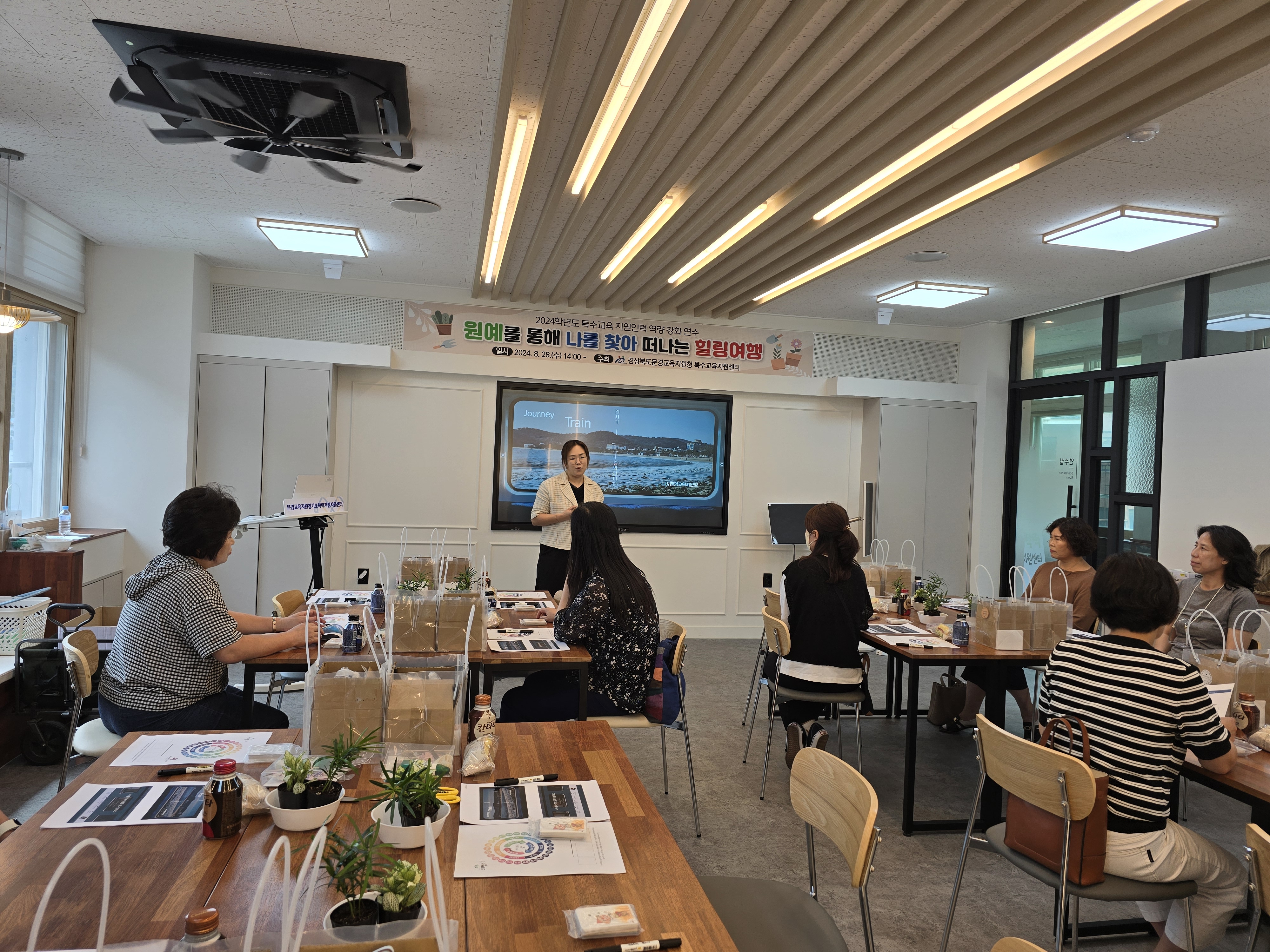 □ 이번 연수는 힐링원예센터 몰댄동산 김정륜 지부장을 모시고, 특수교육 지원인력 역량 강화 연수가 진행되었다. 이번 연수는 ‘원예를 통해 나를 찾아 떠나는 힐링여행’을 주제로 지친 몸과 마음을 회복할 수 있는 시간과 더불어 자신의 강점 찾기를 통해 교육환경에서 긍정적인 가치관 확립 및 전문성을 신장할 수 있도록 하였다.