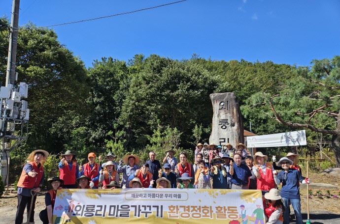 SK에너지서비스 임직원들이 외룡리 주민들과 마을가꾸기 환경정화활동을 펼치고 마을 표지석 앞에서 기념촬영을 하고 있다.