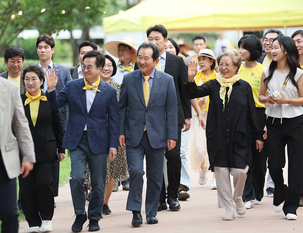 일정 하나를 끝내고 다음 일정을 소화하기 위해 도보로 이동하는 동안 김동연 지사 내외는 노무현 전 대통령을 추모하기 위해 각지에서 모인 시민들의 환영을 받았습니다. 20미터 이동하는데 20분 이상 걸릴 정도였습니다.