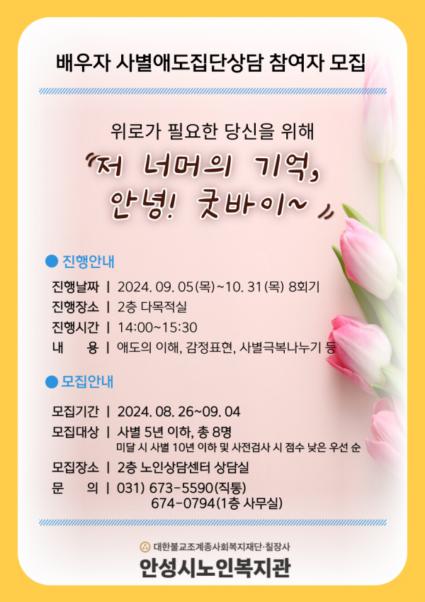 해당 프로그램은 9월 5일부터 10월 31일까지 매주 목요일 오후 2시~4시에 운영되며 안성시 내 거주하는 만 60세 이상으로 사별 5년 이하 총 8명을 모집한다.