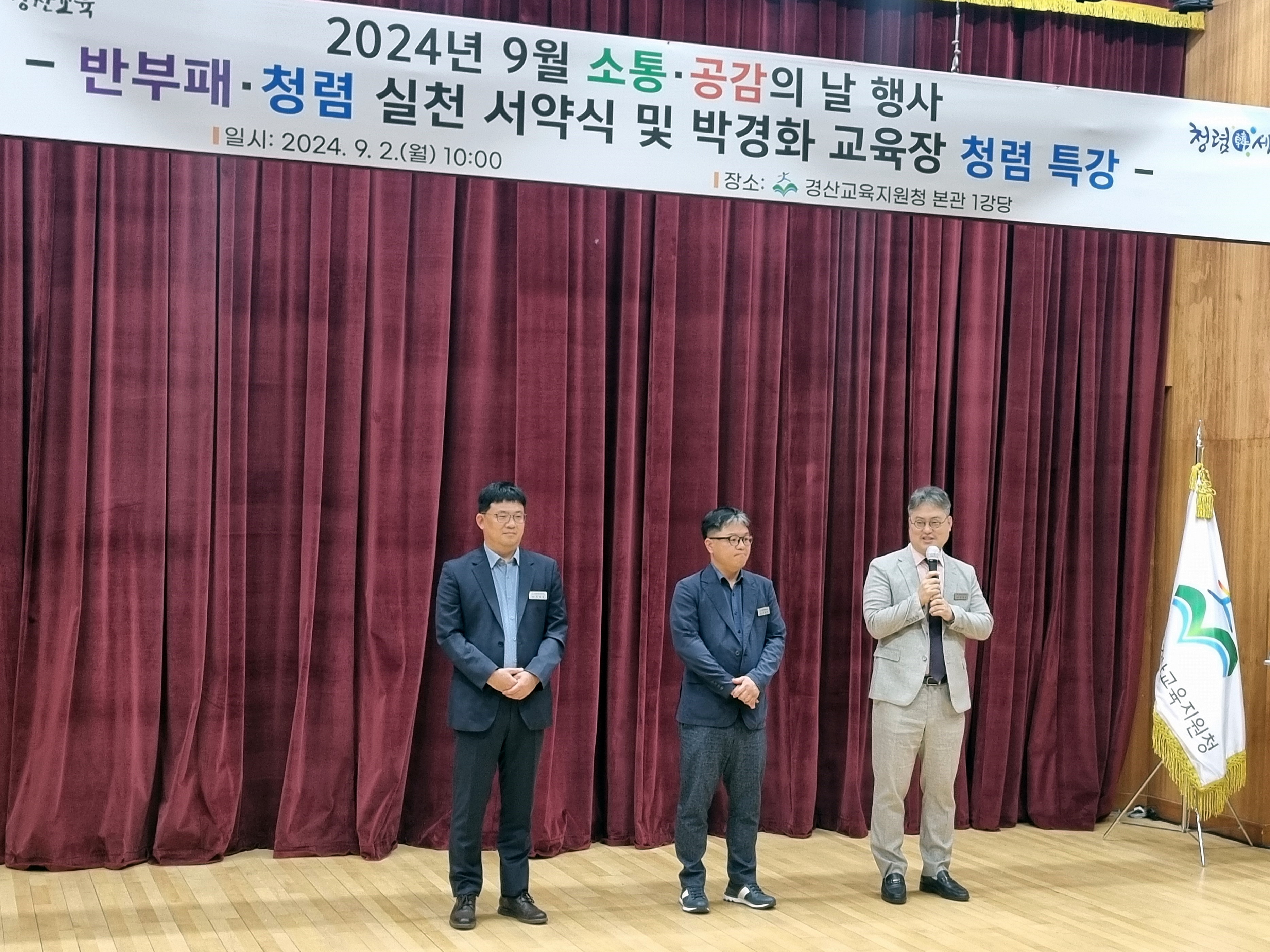 □ 이날 소통·공감의 날 행사는 새로 부임한 박혜옥 교육지원과장을 비롯한 경산교육지원청 전입 직원 소개와 반부패·청렴 실천 서약식, 교육장 청렴특강 등으로 진행되었다.