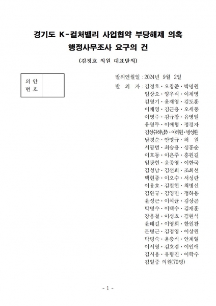 [금요저널] 경기도의회 국민의힘이 2일 ‘경기도 K-컬처밸리 사업협약 부당해제 의혹에 대한 행정사무조사 요구서’를 의회에 제출했다고 밝혔다.