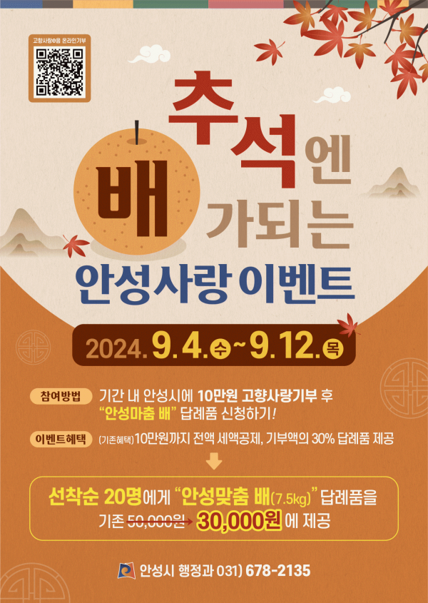 이번 답례품 특별할인 이벤트는 명절을 맞이해 고향사랑기부 참여 확산과 안성시 5대 특산물 중 하나인 안성맞춤 배를 홍보하기 위해 마련됐다.
