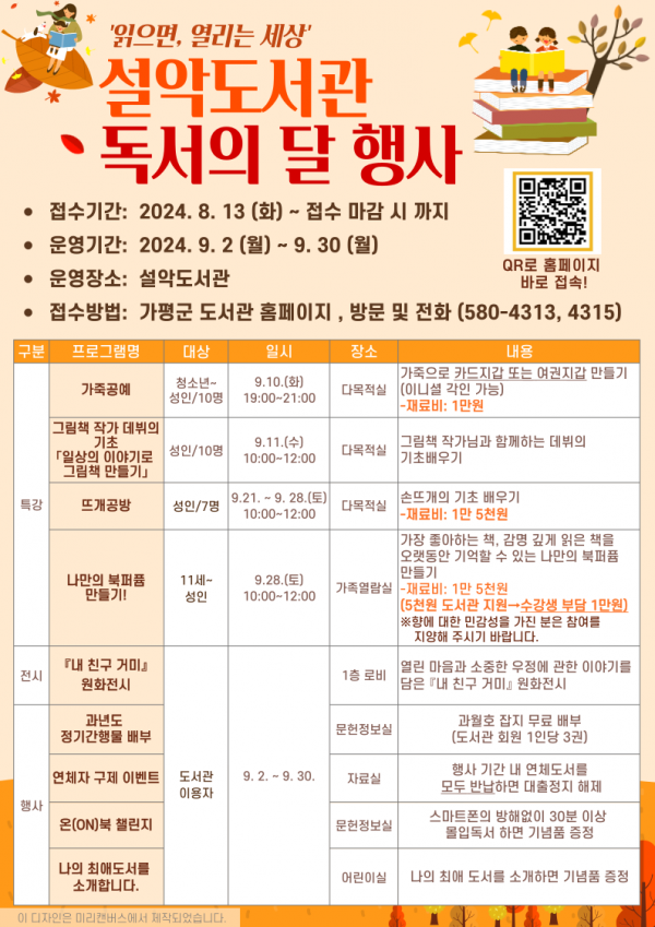 [금요저널] 가평군은 관내 4개 도서관에서 9월 독서의 달을 맞아 30일까지 전시·특강·이벤트 등 다양한 문화행사를 운영한다며 적극적인 이용을 당부했다.