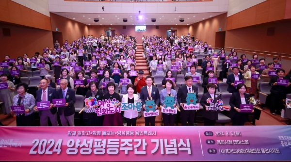 시는 양성평등주간을 기념해 매년 양성평등에 대한 의미를 알리고 공감대를 형성하기 위한 기념식을 여는데, 올해 주제는 ‘함께 일하고 함께 돌보는 양성평등한 용인특례시’로 정했다.