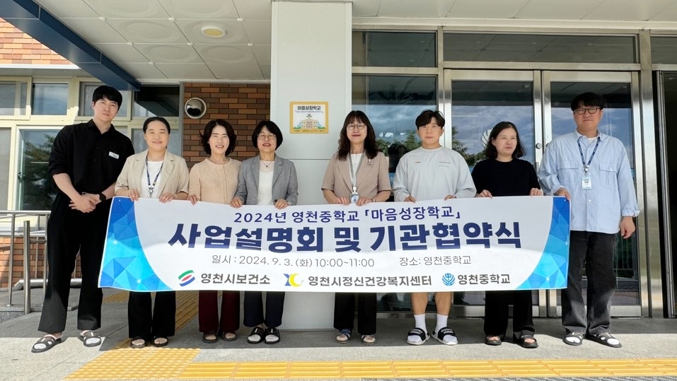 □ 영천중학교(교장 김정남)는 9월 3일 교장실에서 영천시정신건강복지센터와 2024년 신규 마음성장학교 업무 협약식을 체결하였다. 이번 협약식에는 마음성장학교 사업 설명회와 기관협약 체결 및 현판식을 가졌다.