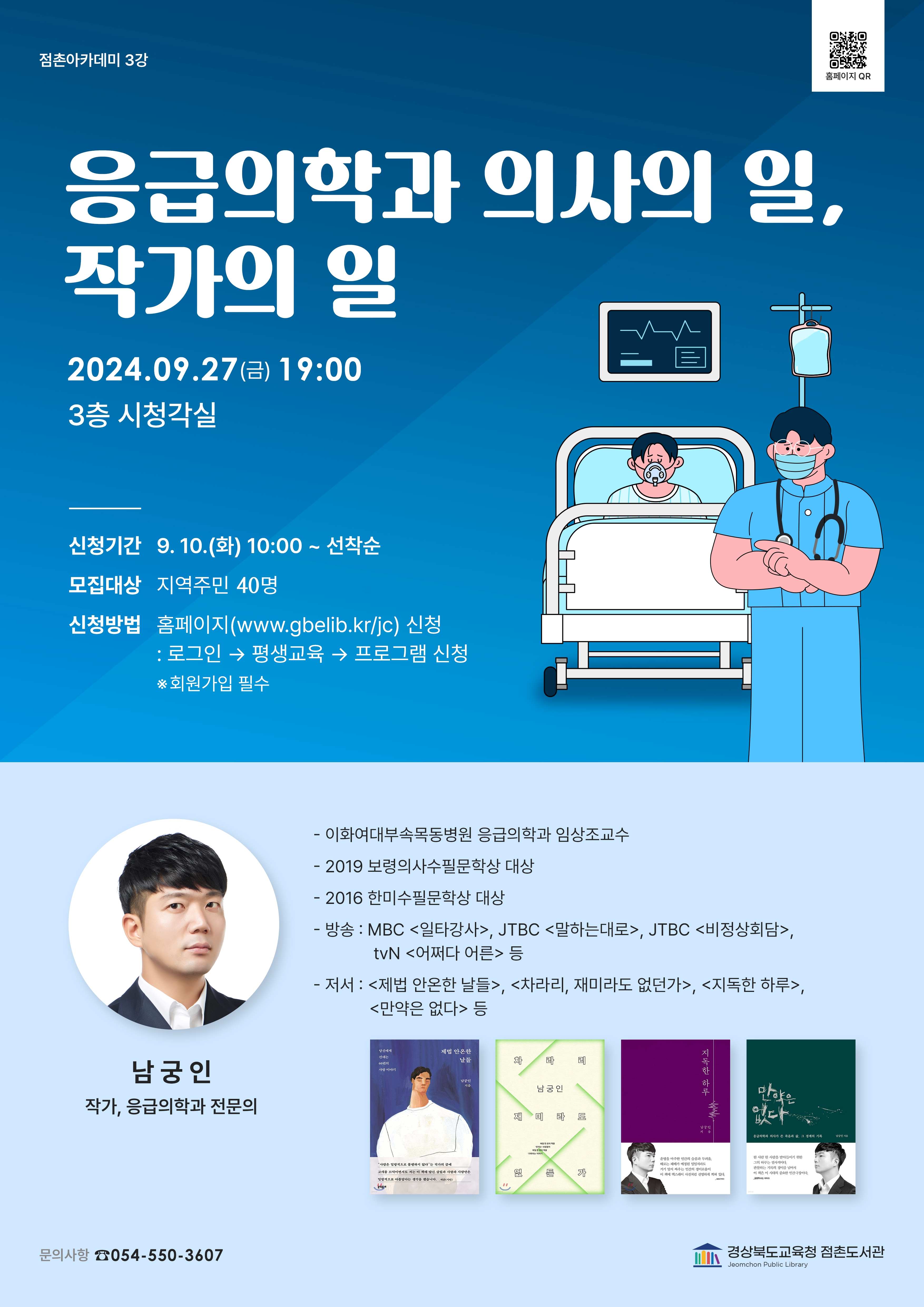□ 경상북도교육청 점촌도서관(관장 박상선)은 점촌 아카데미의 세 번째 강연으로 오는 9월 27일(금) 오후 7시에 글 쓰는 의사 남궁인을 초청해 특강을 개최한다.