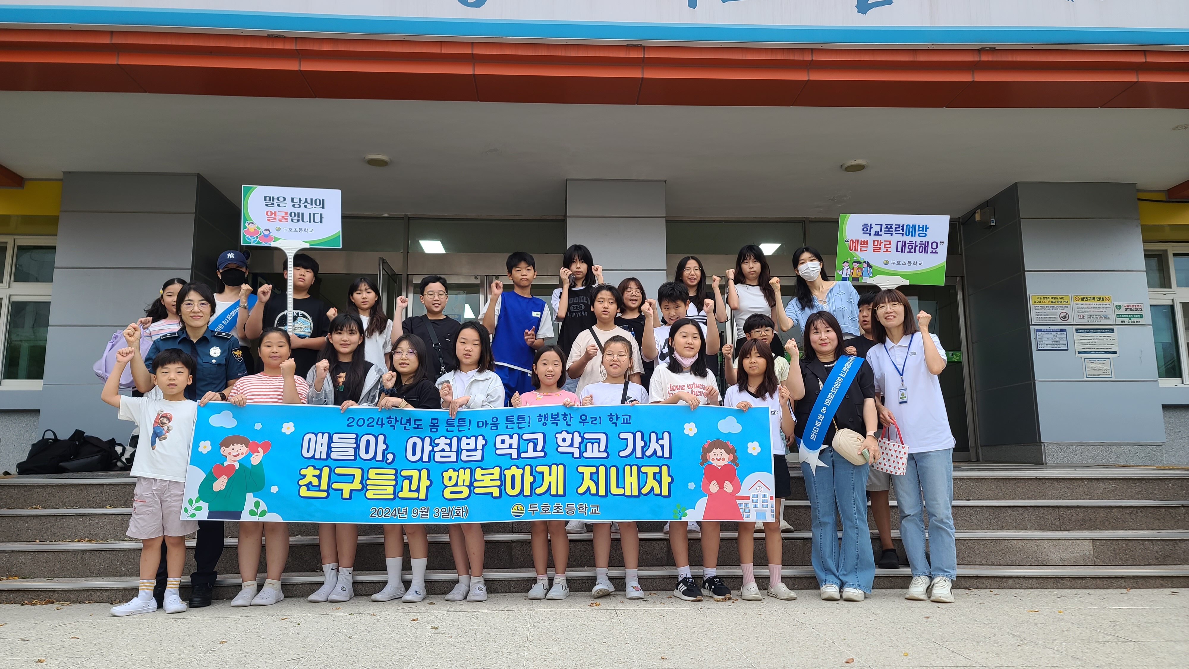 ▣ 두호초등학교(교장 안병현)는 2024년 9월 3일 등교시간에 전교생과 교직원을 대상으로 “몸 튼튼! 마음 튼튼! 행복 학교 만들기 캠페인”을 실시하였다.