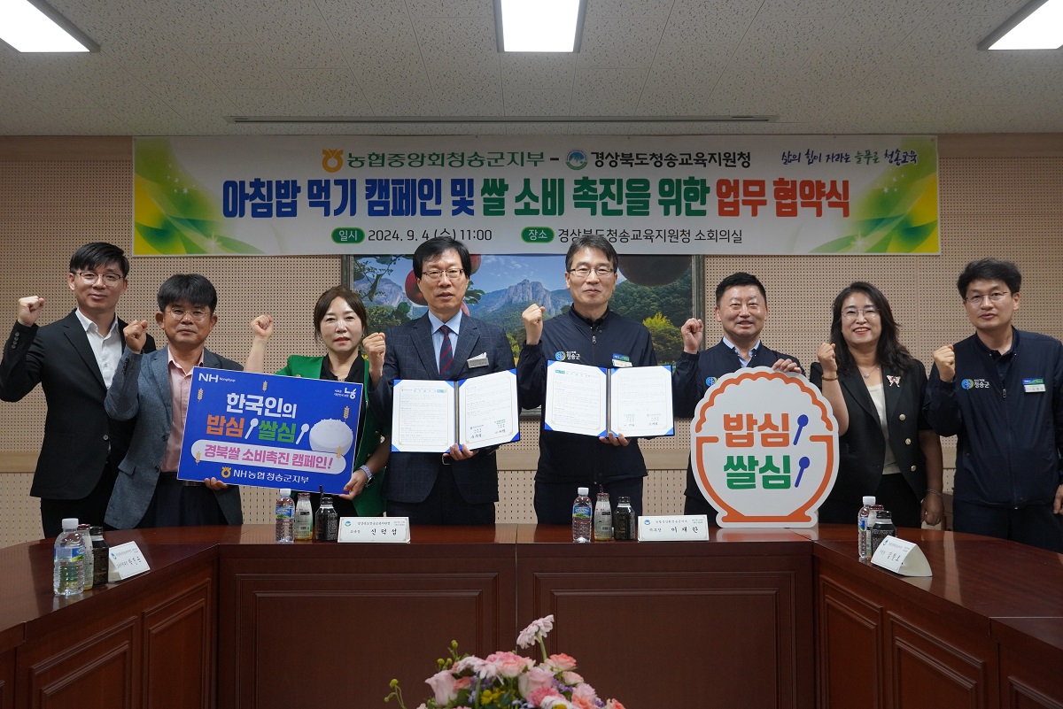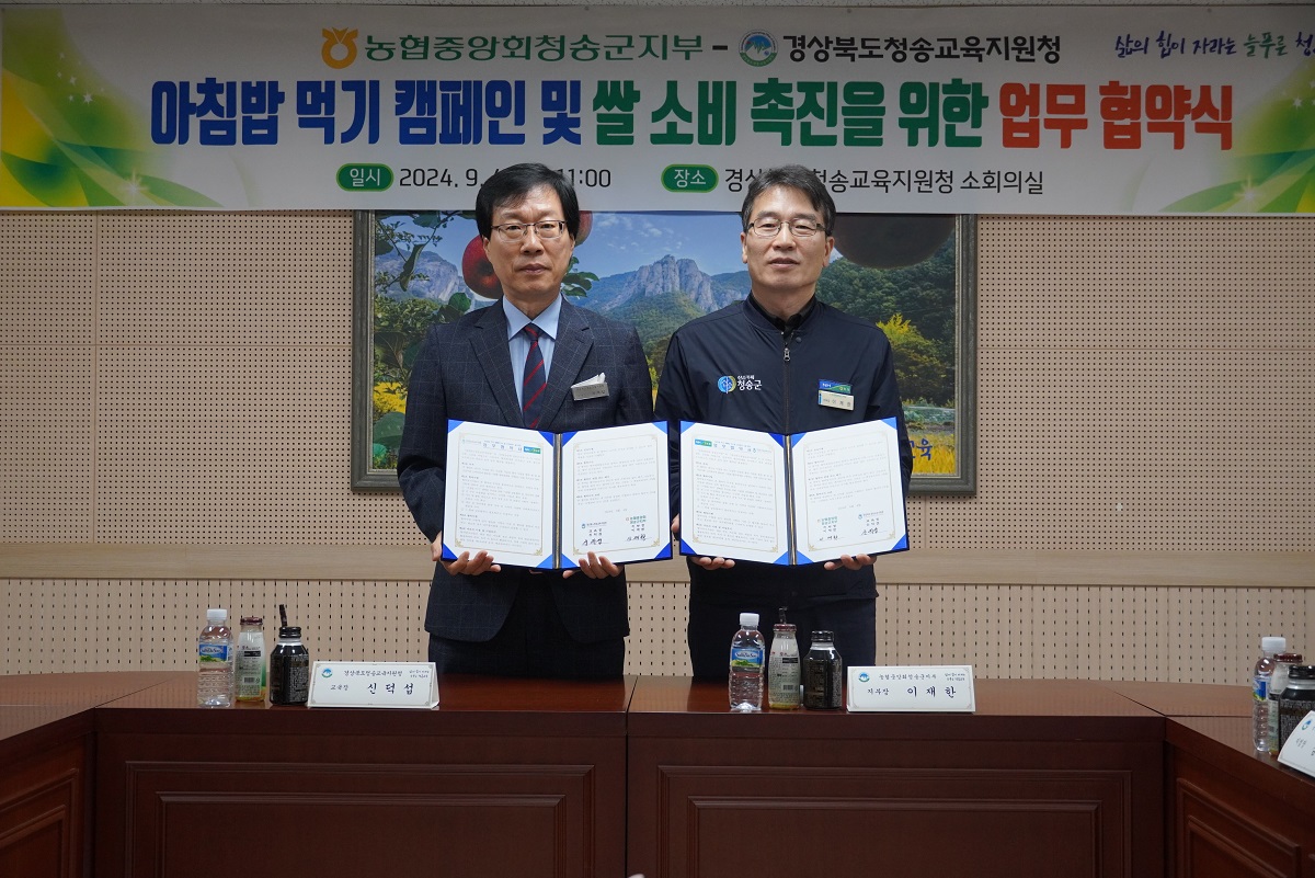 □ 경상북도청송교육지원청(교육장 신덕섭)은 4일(수) 소회의실에서 농협중앙회청송군지부(지부장 이재한)와 아침밥 먹기 캠페인 및 쌀 소비 촉진을 위한 업무 협약식을 체결하였다.