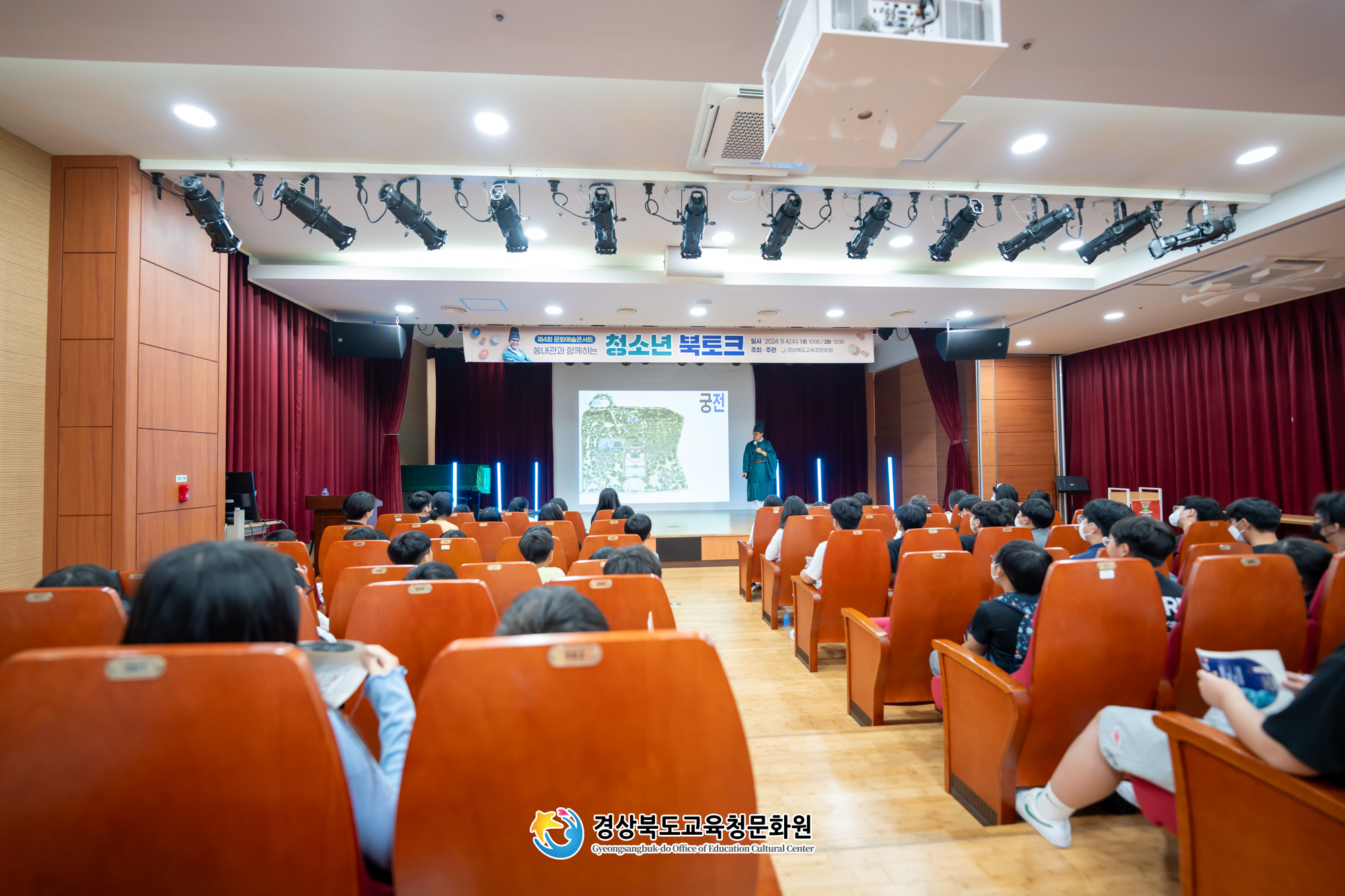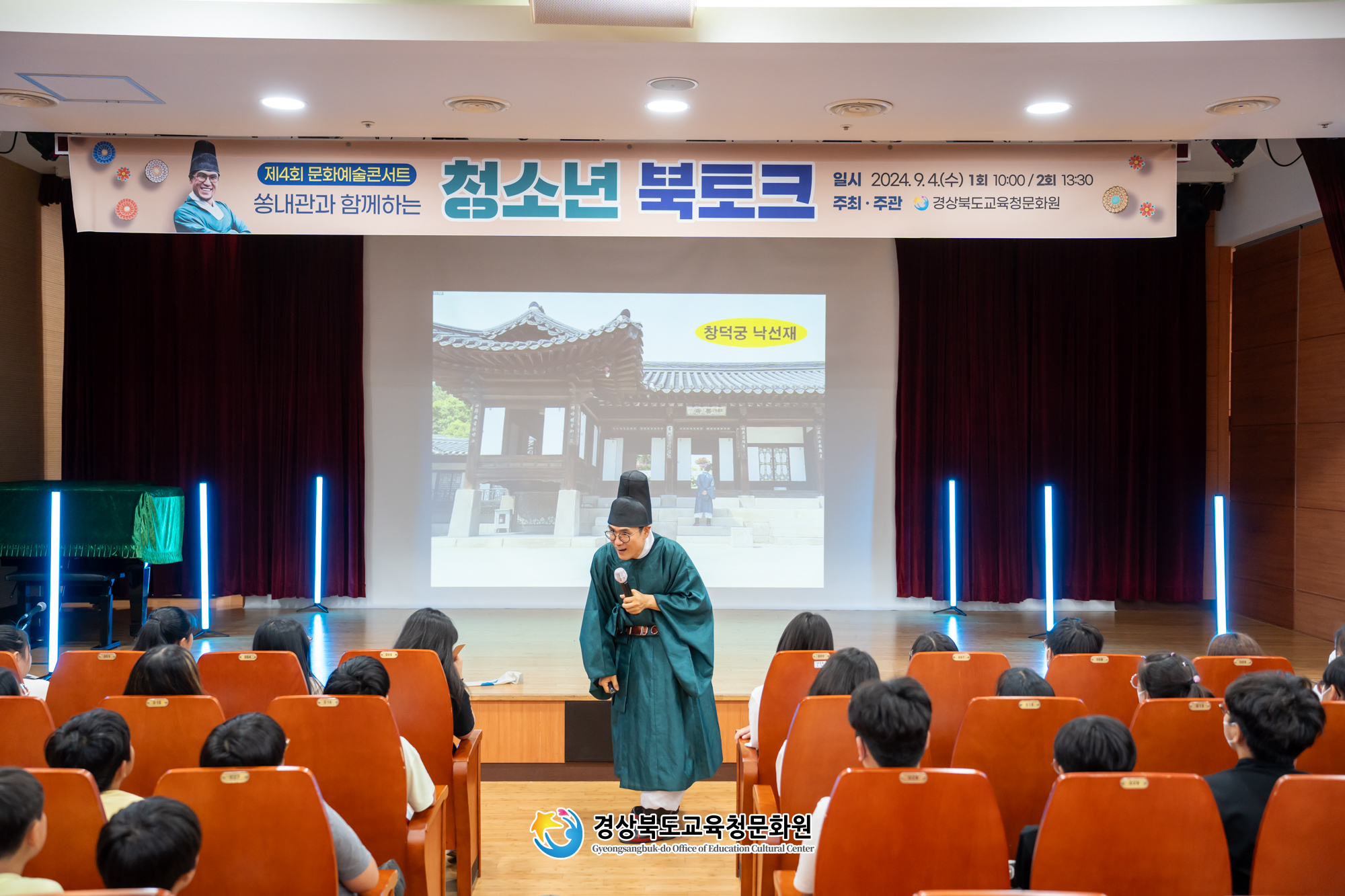 경상북도교육청문화원(원장 박민아)은 9월 독서의 달을 맞이하여 <쏭내관과 함께하는 청소년 북토크>를 9. 4.(수) 경북 도내 초・중학생 8개교 185명이 참여한 가운데 성황리에 개최되었다.